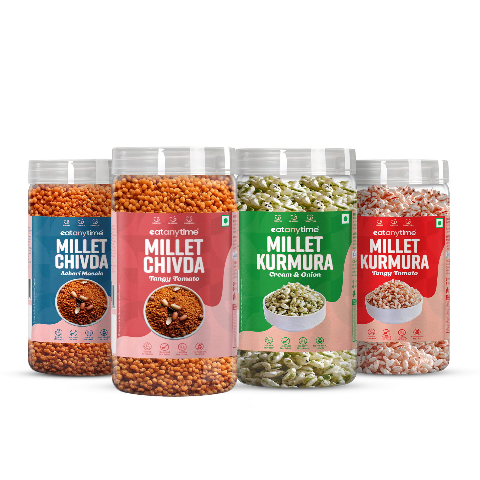 EAT ANYTIME Millet Chivda Tangy Tomato, Chivda Achari Masala 300g + Kurmura Tangy Tomato, Kurmura Cream & Onion 125g ( Pack of 4 Combo)